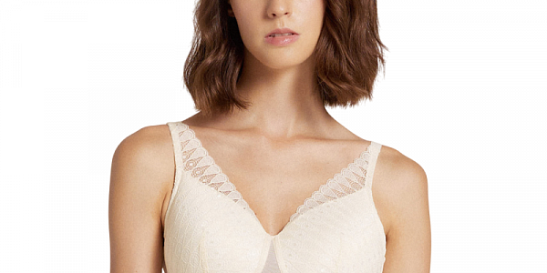 Поверх гладкой чашки, которая придает бюсту красивую округлую форму, проходит кружевное полотно с орнаментом в горошек, имитирующее бралетт. Завышенная линия декольте, высокая пройма и широкая спинка, которая у застежки становится выше, а также кружево, заходящее на бретели, скрывают возможные неровности и гарантируют безупречную посадку.