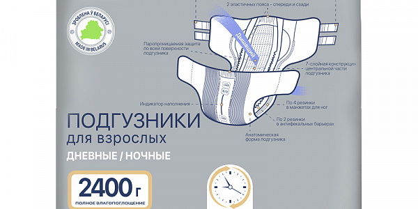 - высокая впитываемость и анатомическая форма подгузника обеспечивают надежную защиту в случае длительного использования днем и ночью, в том числе на боку;
