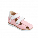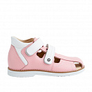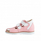 Классические сандалии для девочек с полузакрытым носом из натуральной гладкой кожи розового цвета с деталями из белой кожи для ежедневной профилактики плоскостопия. Застежка на два ремешка с липучками для наилучшей фиксации ножки ребенка. Широкий, устойчивый каблук, специальной конфигурации - каблук Томаса. Многослойная, анатомическая стелька со сводоподдерживающим элементом для правильного формирования стопы. Жесткий фиксирующий задник с удлиненным крылом надежно стабилизирует голеностопный сустав во время ходьбы, препятствуя развитию патологических изменений стопы. Упругая, умеренно-эластичная подошва, имеющая перекат позволяющий повторить естественное движение стопы при ходьбе для правильного распределения нагрузки на опорно-двигательный аппарат ребенка. Подкладка из натуральной кожи без швов.